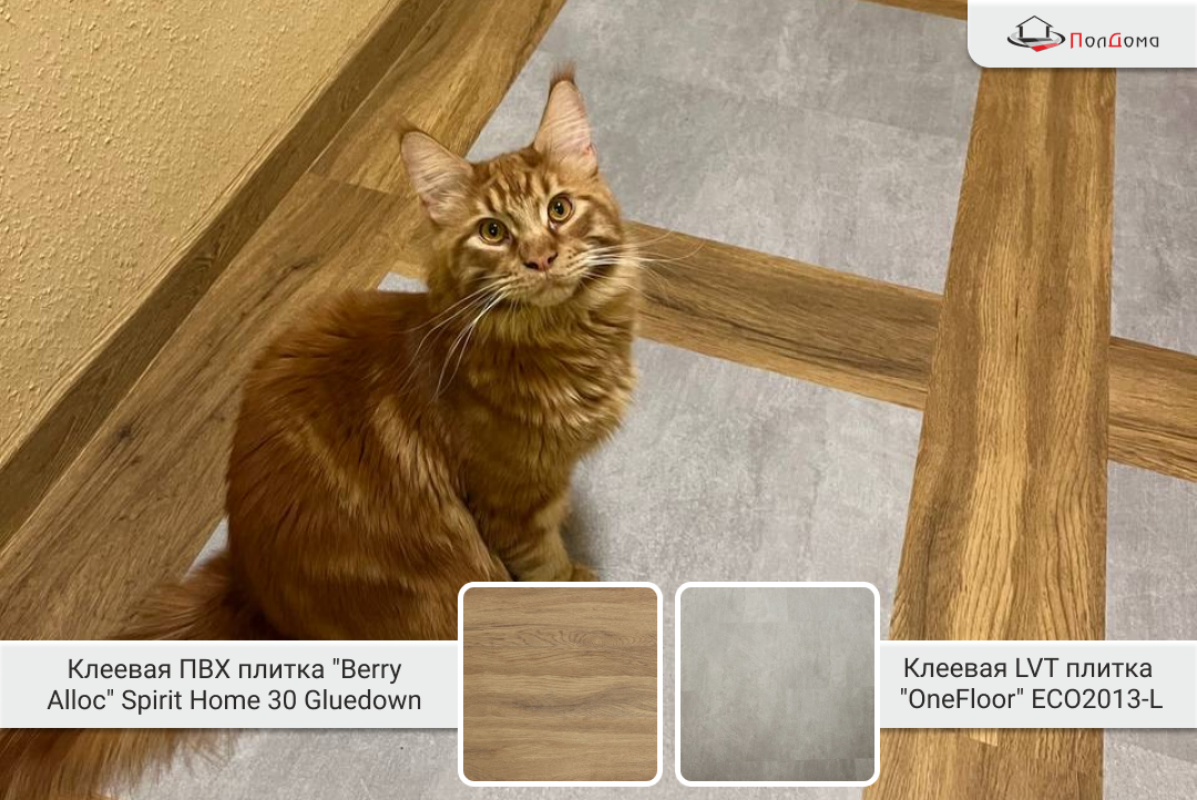 Для реализации этой дизайнерской задумки мы использовали два вида клеевой ПВХ плитки, которые великолепно сочетаются друг с другом по текстуре и цвету: