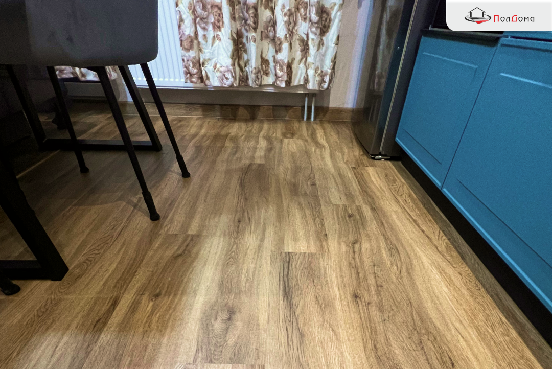 После укладки кухня преобразилась: пол стал визуально теплее, пространство — уютнее, а интерьер приобрёл завершённый вид. Благодаря ровному основанию и профессиональной укладке стыки незаметны, поверхность выглядит как единое целое. Ходить по новому полу приятно и босиком, и в обуви — мягкий винил гасит шаги и добавляет комфорта.